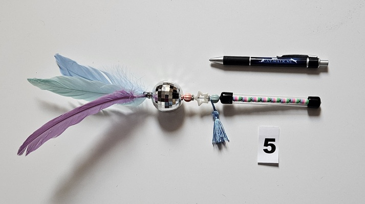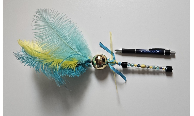 Gekleurde veren, gekleurde folie, bedeltjes en een belletje om de aandacht te trekken.